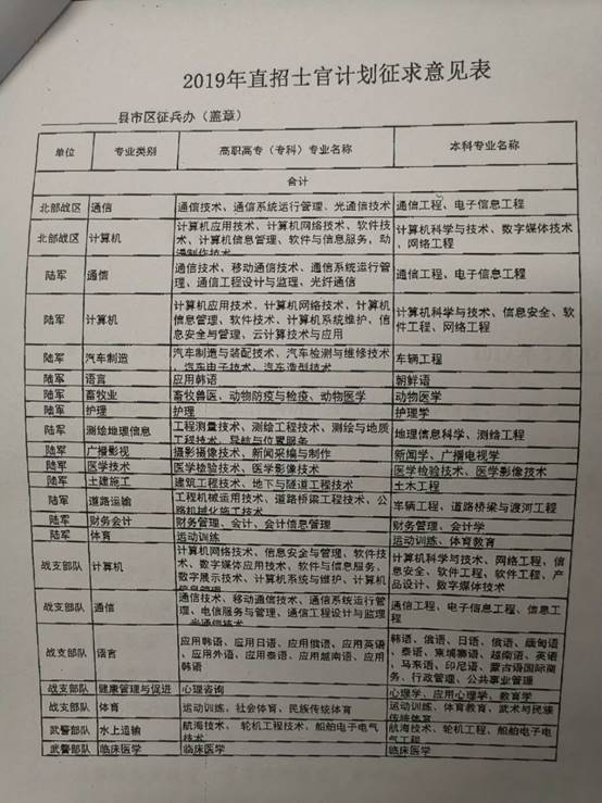 2019年全国直接招收士官报名即将开始,按照哈尔滨市松北区人民政府征兵办公室要求,对有应招意愿毕业生(2019年应届毕业生)进行摸底调查,现在要在学院进行预报名。直招士官条件为2019年9月1日前普通高校毕业的大学生、年龄不超过24周岁。专业不在计划表内的,根据实际情况上报。请按照要求通知到学生,对有意愿的学生请于2019年4月8日9:00前报名并填写直招士官情况统计表(附件2),并以系为单位上报学武装部(学生处)。
