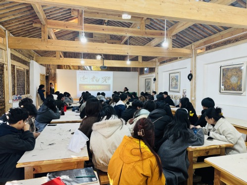 在丽江白沙锦绣艺术院,东巴文字传承人向师生揭开了这一古老象形文字的神秘面纱。从东巴经书的抽象符号到木雕绘画的自然意象,学生们尝试将文字中的“山、水、鸟、兽”等元素转化为空间设计草图,探索“以形达意”的跨界表达。艺术院内陈列的东巴刺绣与木雕作品,更让学生感受到传统技艺在当代艺术中的生命力,激发了对文化传承与创新融合的思考。