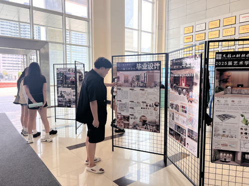 2025届毕业设计围绕 “弘扬家乡文化 —— 打造城市名片”、“生活与生态 —— 创造美好未来” 两大主题展开。走进尚学楼一楼,一件件构思巧妙的作品展板有序陈列,涵盖了居室空间设计、商业空间设计、办公空间设计等多个领域。以 “弘扬家乡文化 —— 打造城市名片” 为主题的作品中,有的深挖地方非遗文化,将传统手工艺元素融入现代商业空间设计,让古老文化在新场景中焕发活力;有的以家乡特色建筑为灵感,打造兼具文化底蕴与时尚感的城市地标景观方案。而紧扣 “生活与生态 —— 创造美好未来” 主题的作品同样亮点十足,从运用环保材料设计的绿色住宅,到通过生态修复手段改造的城市湿地景观,无不展现出学生们对可持续发展理念的践行与探索。