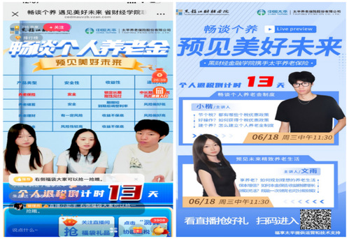 直播过程中,行业资深专家张清雪、24级保险学两名学生化身主播,围绕养老金融市场现状、未来趋势等热点话题展开深度讲解,通过生动案例与详实数据,将复杂的金融知识变得通俗易懂。直播结束后校企双方迅速组织开展复盘会议,共同回顾活动亮点,剖析现存问题,为后续合作提供坚实的支撑。