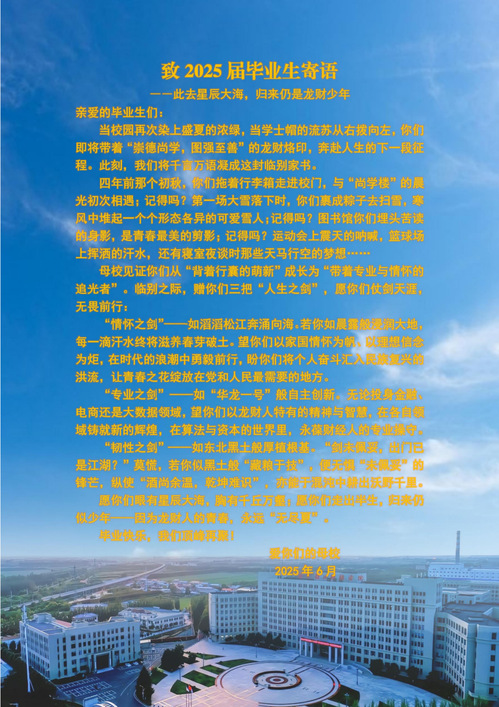 当校园再次染上盛夏的浓绿,当学士帽的流苏从右拨向左,你们即将带着“崇德尚学,图强至善”的龙财烙印,奔赴人生的下一段征程。此刻,我们将千言万语凝成这封临别家书。